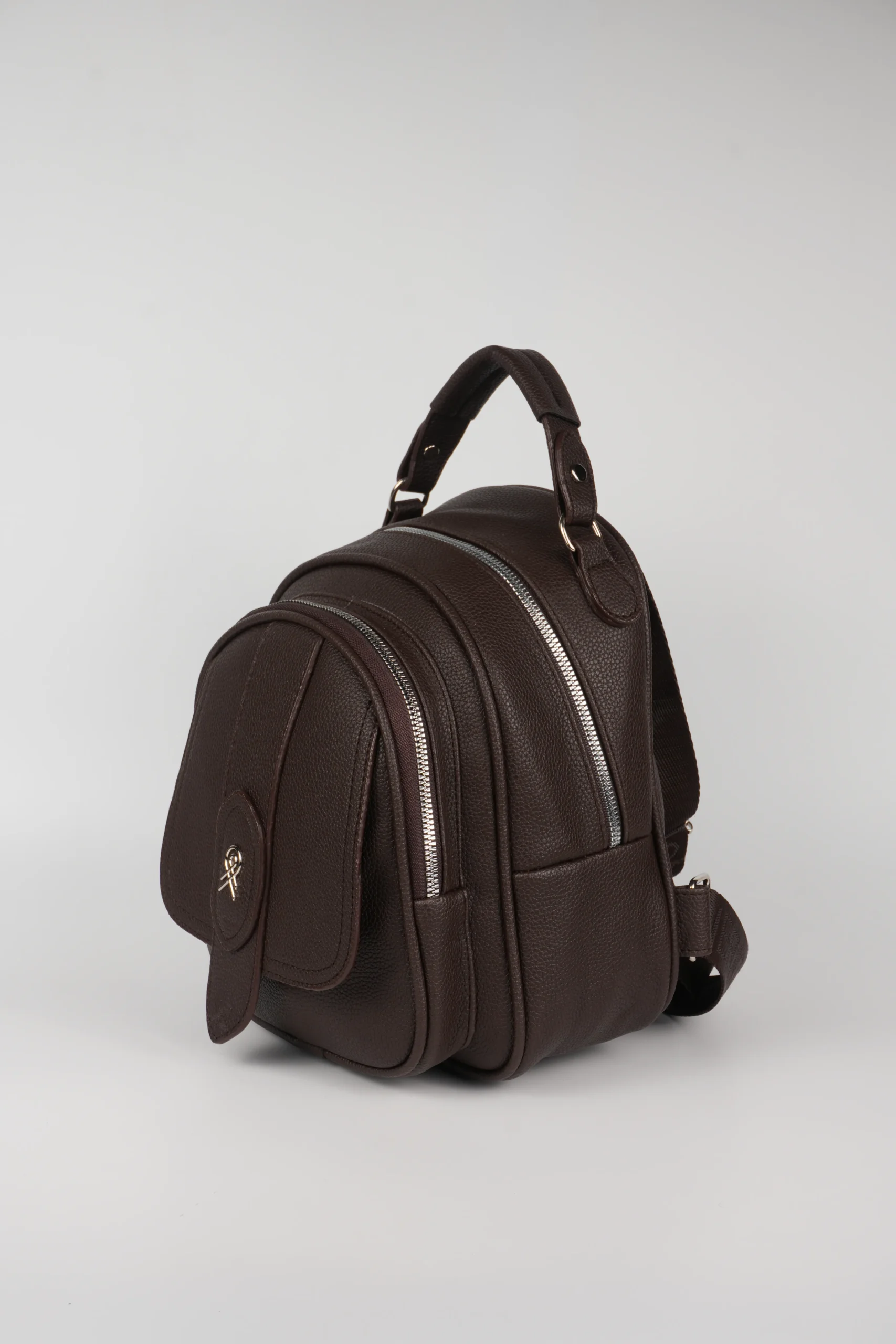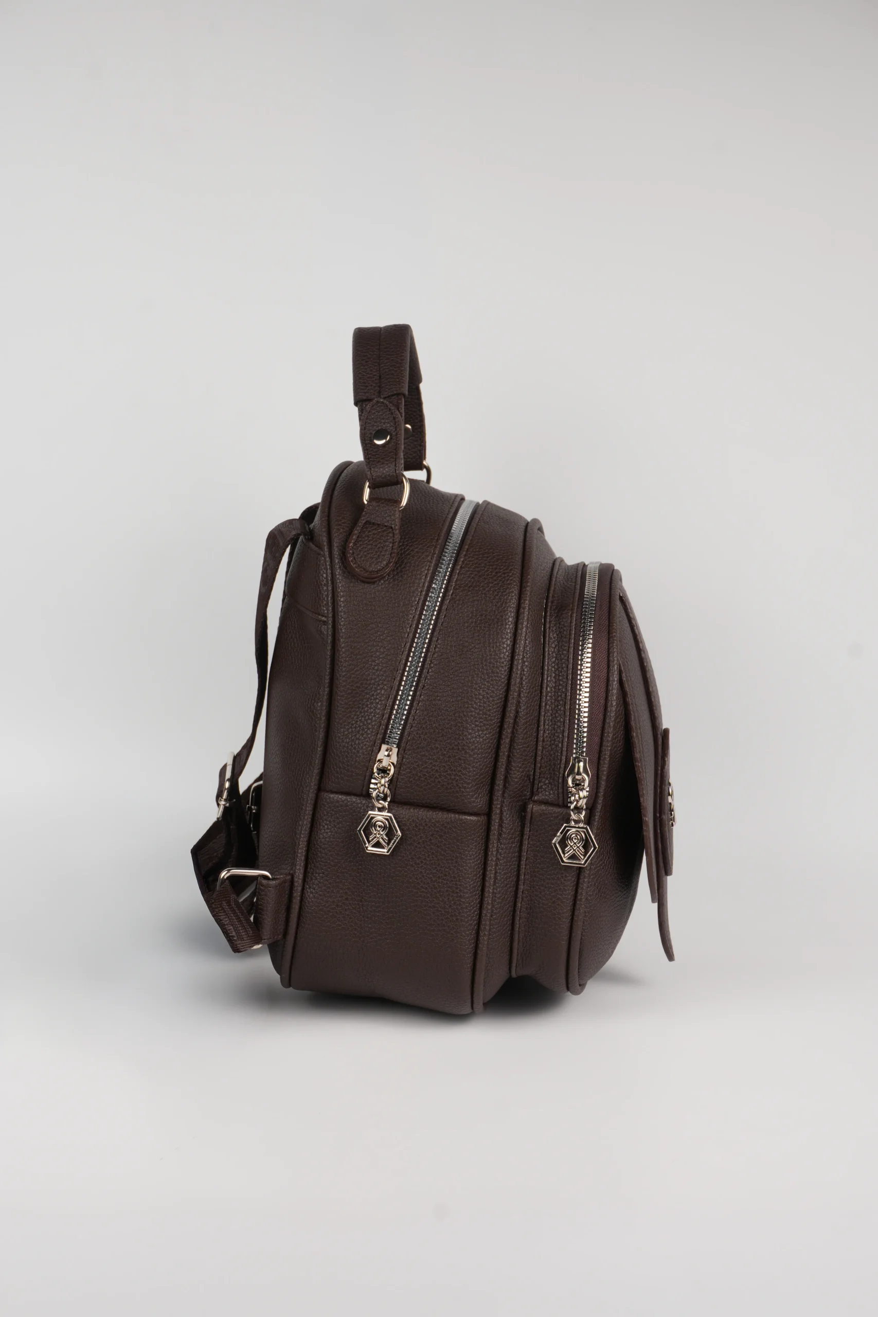 Ön yüzeyde yer alan fermuarlı bölmeler, sık kullanılan eşyalar için pratik erişim sağlar. Yan kısımdaki kapaklı cep ise ekstra depolama alanı sunar. Metal fermuar ve aksesuar detayları çantaya şık bir görünüm kazandırır.